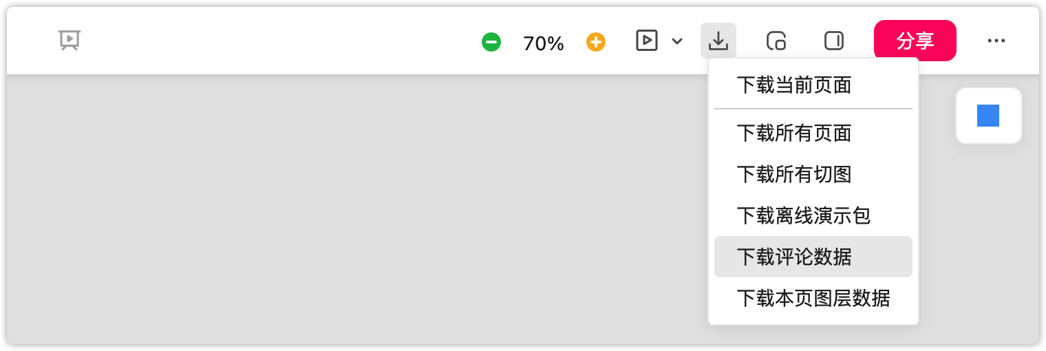 如果你的项目中添加了图钉评论,可以在右上角“下载评论数据”,下载下来会是 .csv 的文件。