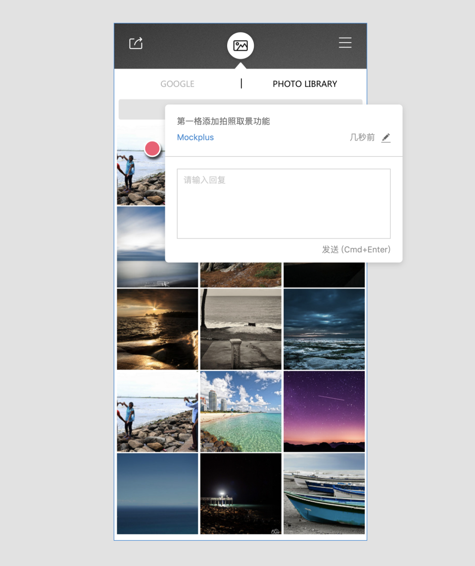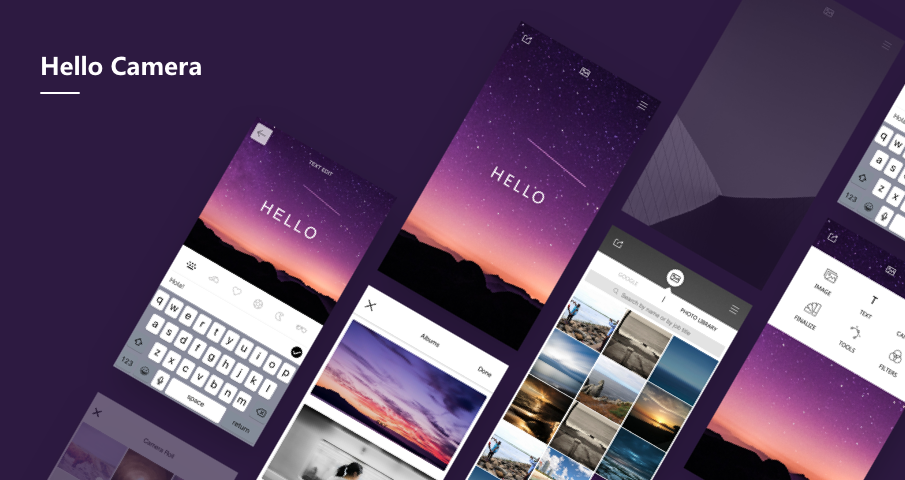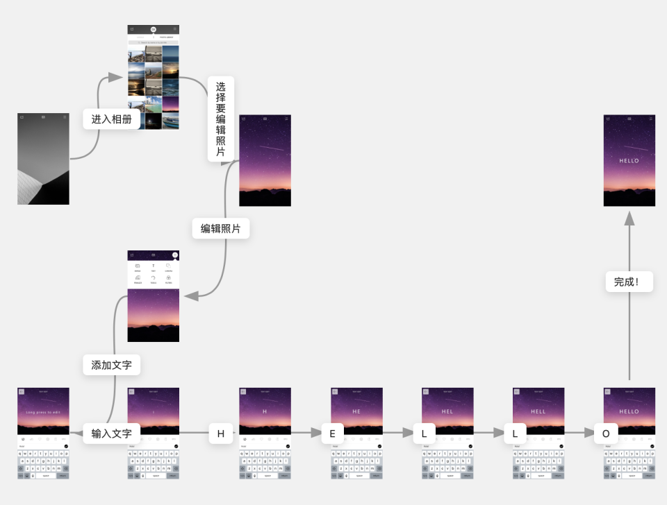 Hello Camera是一款功能简单易操作的修图App,可以通过简单的操作给照片添加多种修饰效果。简洁易操作,学习曲线平缓。例子中将展示使用Hello Camera给照片添加并输入文字的操作流程。我们可以使用摹客中最常用的8种交互方式以及15种交互动画,展示基本的页面跳转,以及模拟文字输入的效果。 演示如下: