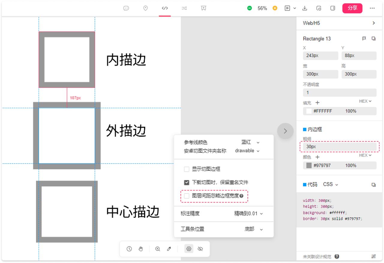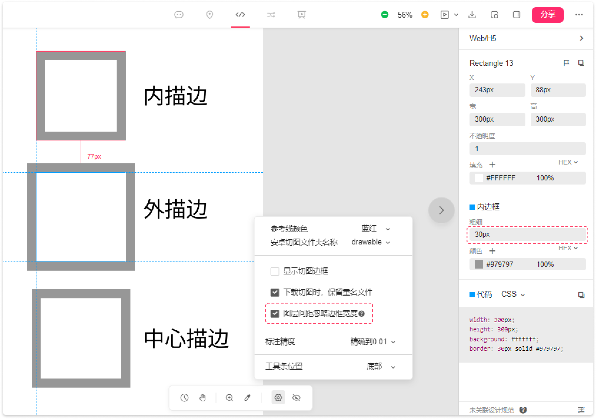 如果勾选了“图层间距忽略边框宽度”这个选项,图层间距的计算会减去图层外的描边宽度。举个例子,在设计软件中给图层设置外描边为30px,上传到摹客后,选中该图层,查看其与其他图层的间距时,会减去30px。