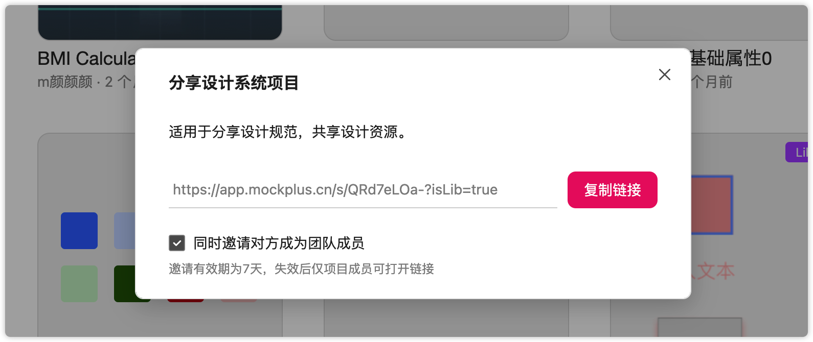 将设计规范分享给他人时,摹客提供了一个选项:“同时邀请对方成为团队成员”。勾选后,可以同时邀请对方成为团队成员(邀请他人加入团队的权限仅管理员和项目所有者拥有)。