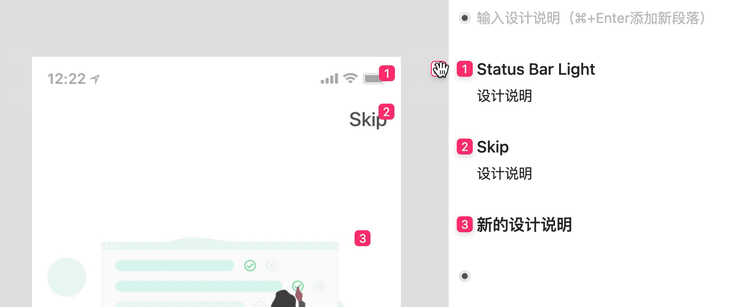二是直接在右侧面板撰写说明,完成撰写后,鼠标拖拽段落前的锚点与对应的图层进行绑定。注意:一个图层只能与一个段落文本进行绑定,已经关联设计说明的图层不可再进行重复绑定。