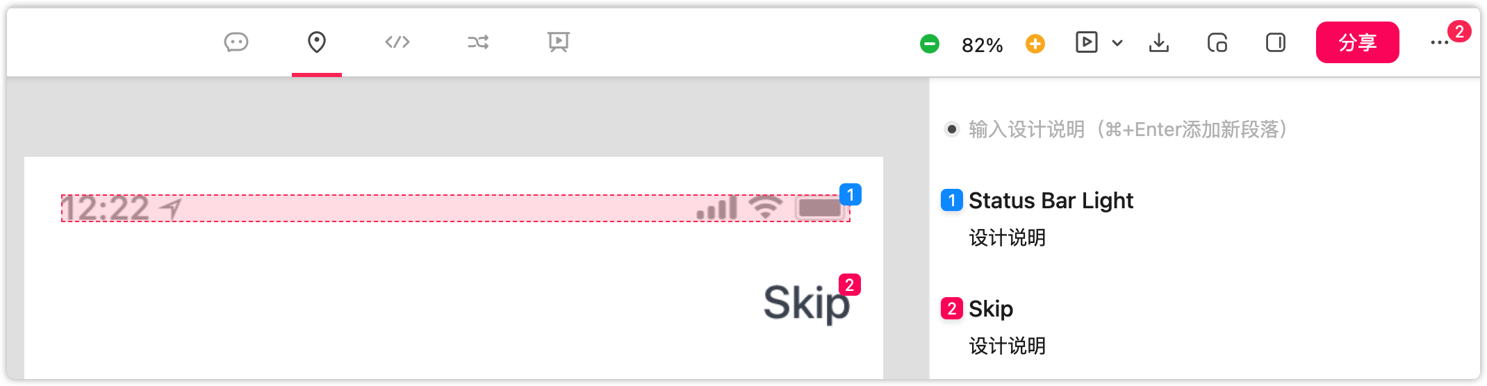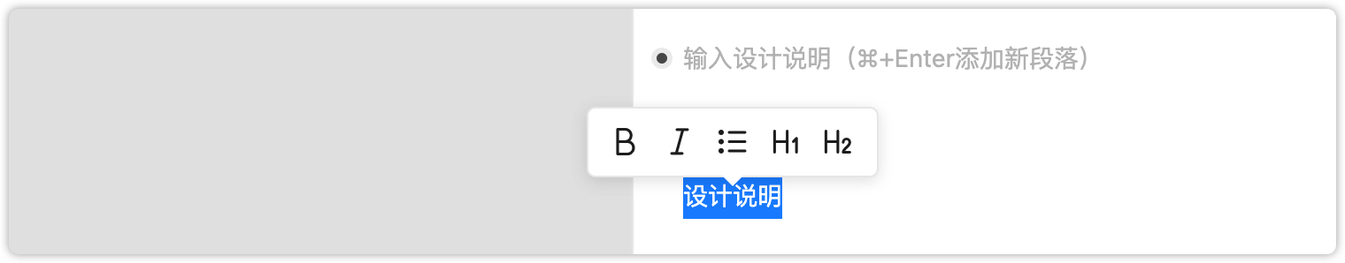设计说明支持富文本,完成撰写后,可选中文字,此时会出现富文本的状态栏,可设置文本的样式。设计说明会随设计稿同步更新。
