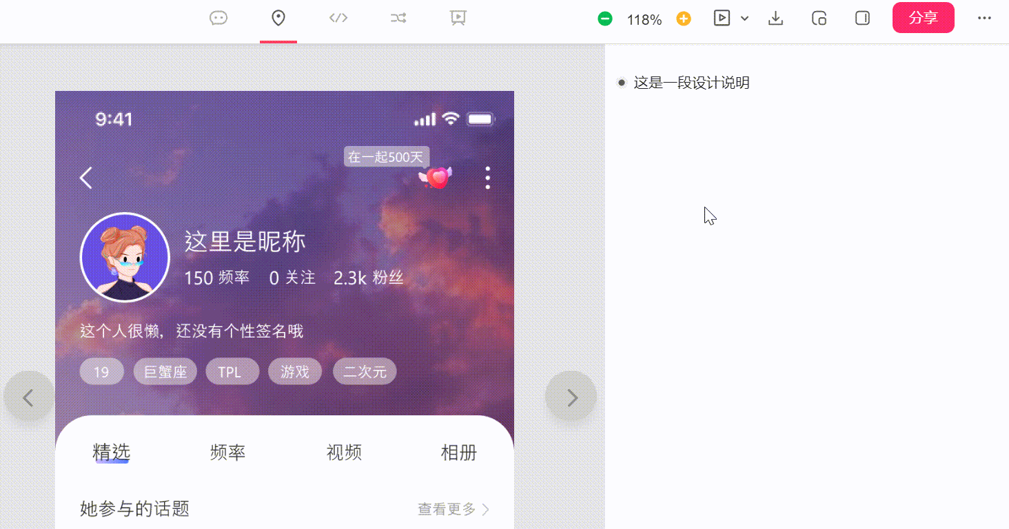 有两种方式可以进行撰写,一是在设计稿单击图层,单击后可以在右侧面板添加设计说明;