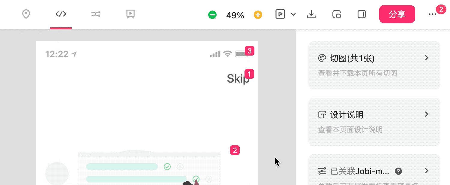 在开发模块,新增了“设计说明”板块,点击后可查看本张设计稿的全篇设计说明,也可单击选中某个图层,在右侧的属性面板上,会展示该图层对应的设计说明。