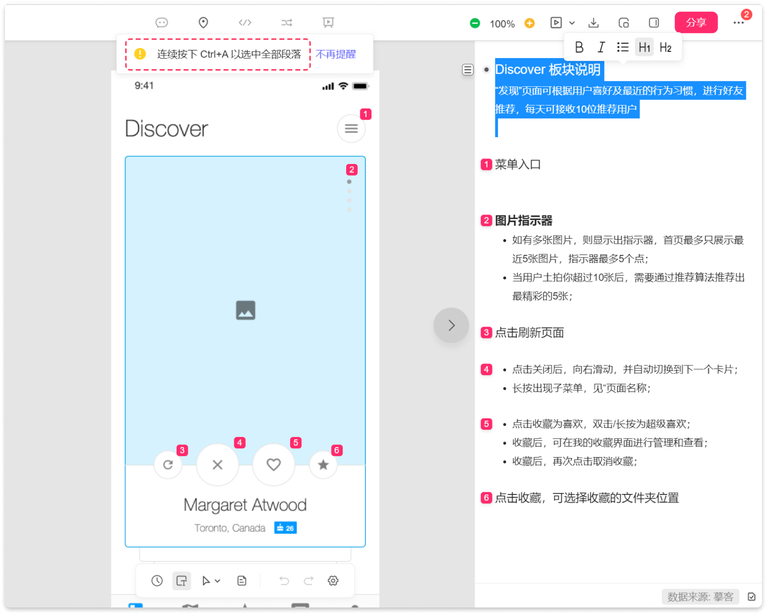 如果想删除单页设计说明的所有文字内容,使用 ⌘+A (win系统 Ctrl+A)可选中当前段落,连续按下 ⌘+A (win系统 Ctrl+A)可选中全部段落,选中后即可进行复制、删除等操作。
