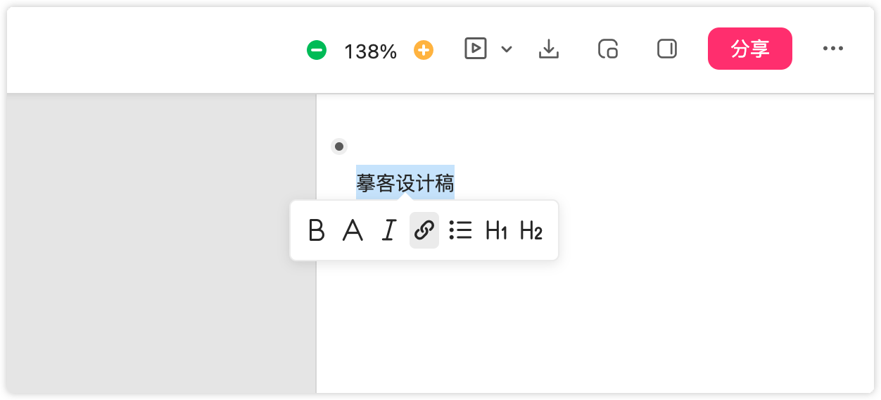 方法二:选中文字添加超链接,同时支持一键链接到设计稿、原型稿。(注意:取消文本超链接需要选中整行文本再点击超链接按钮取消,或清除文本重新输入并添加超链接。)