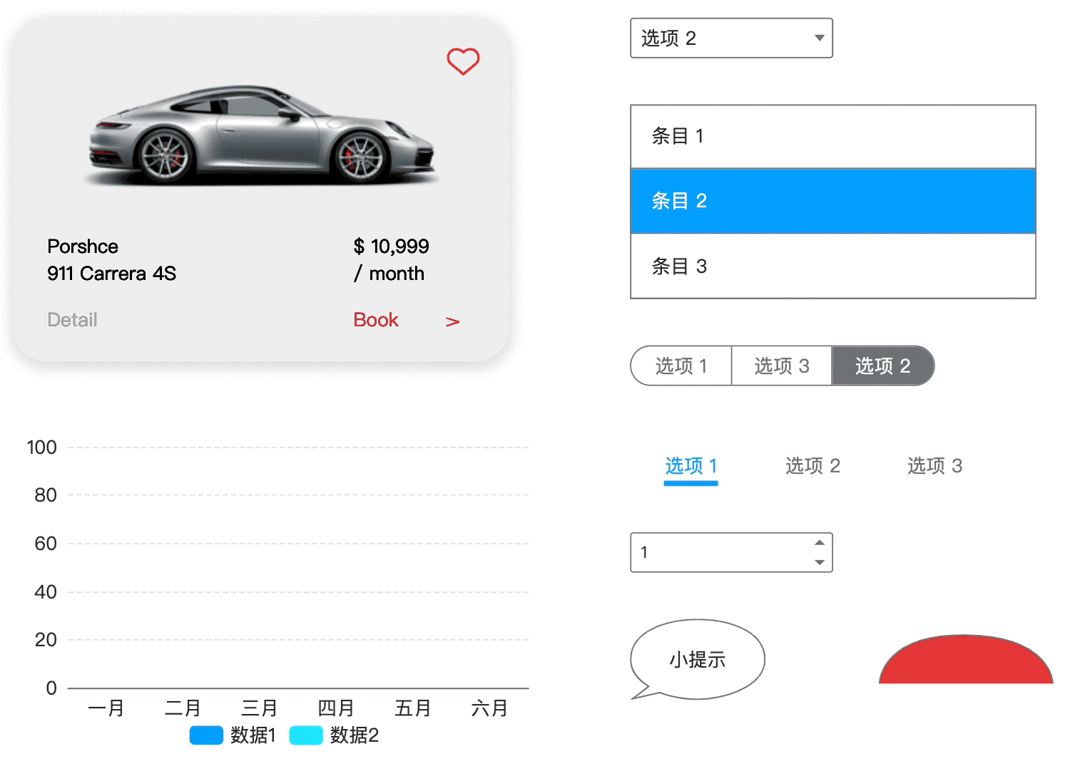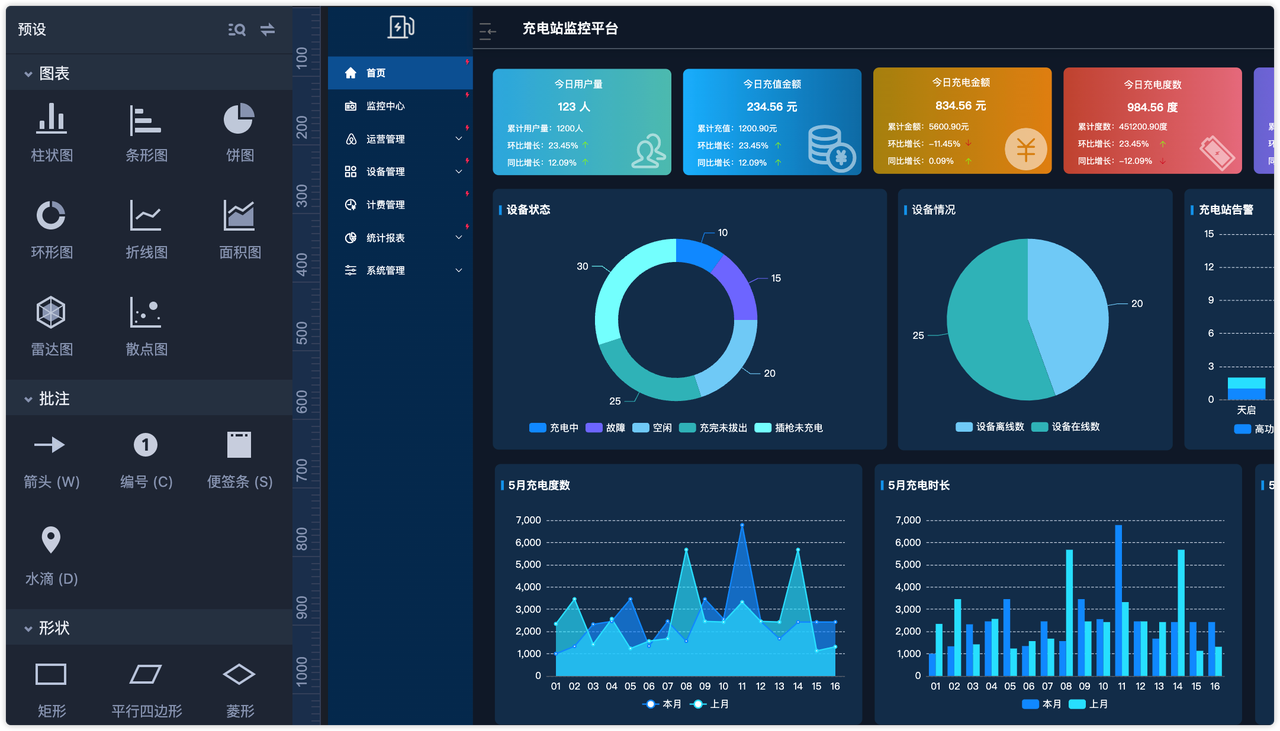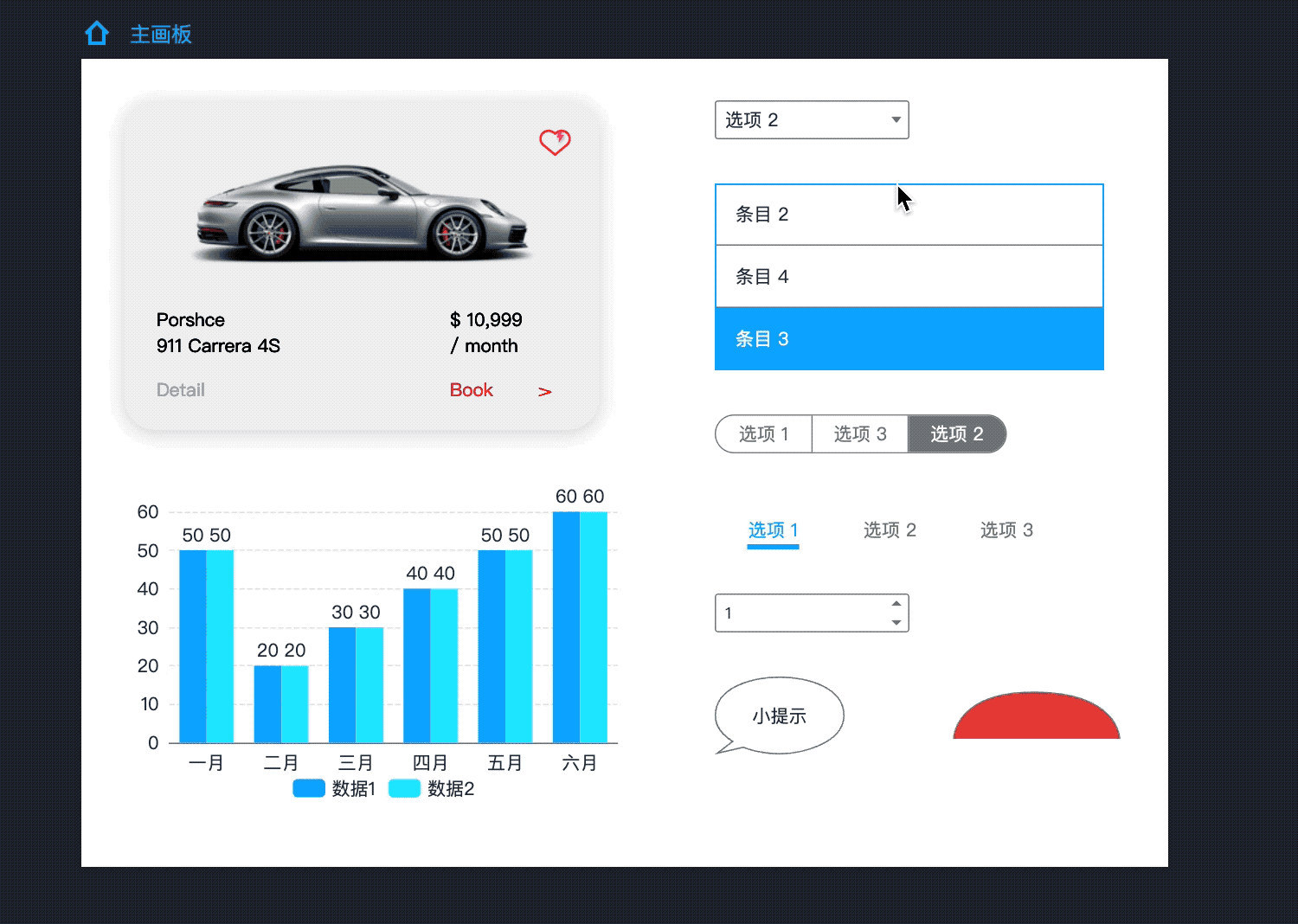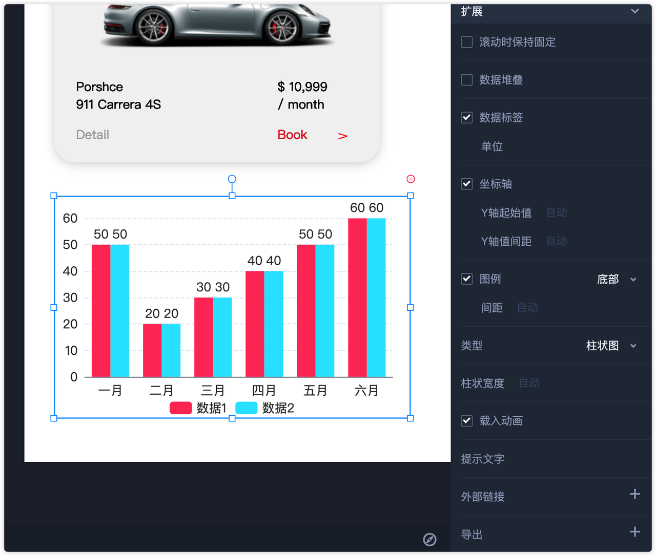 图表组件:对于经常制作后台项目的小伙伴,摹客RP自带的图表组件更会让你的设计效率飙升。多种类型的图表组件,每一个都支持超高自由度的数据编辑,并且提供丰富的元素结构设置项。在演示时,图表组件同样自带非常细致的载入效果及可交互的数据查看效果。