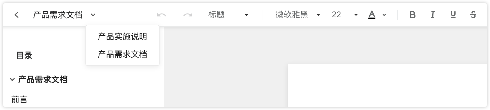 点击项目树左上角的“+”号图标后,选择“新建产品文档”,在弹窗中选择“新建产品文档”,即可创建一个在线编辑文档。