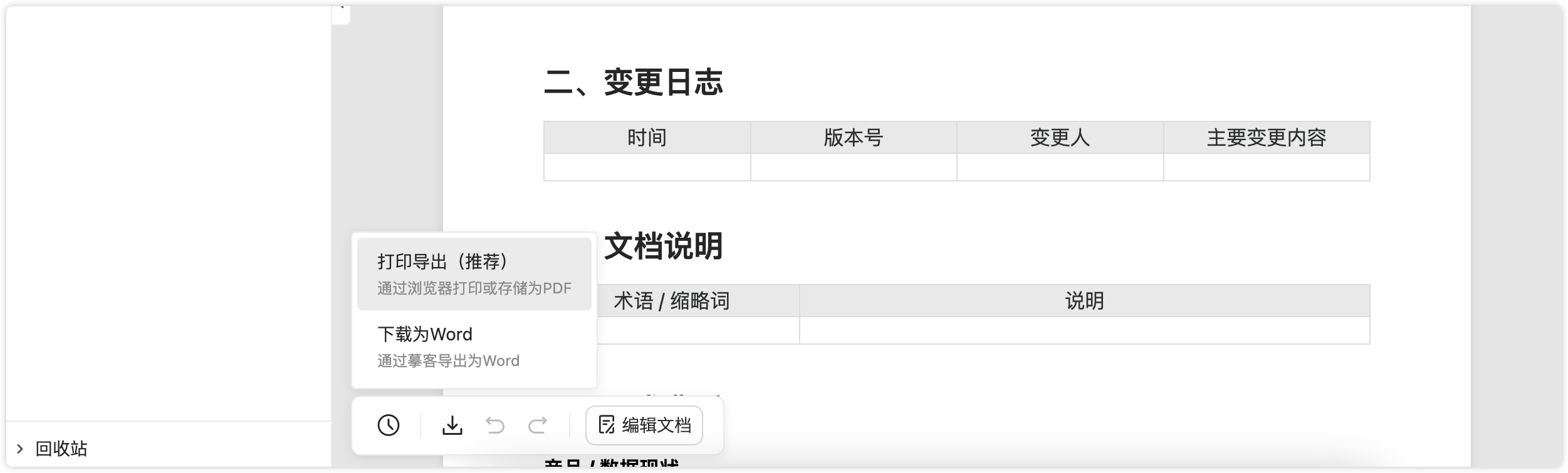 文档保存后,在非编辑模式下,点击右上角的“下载”图标,即可将文档导出为PDF。注:推荐使用“打印导出”