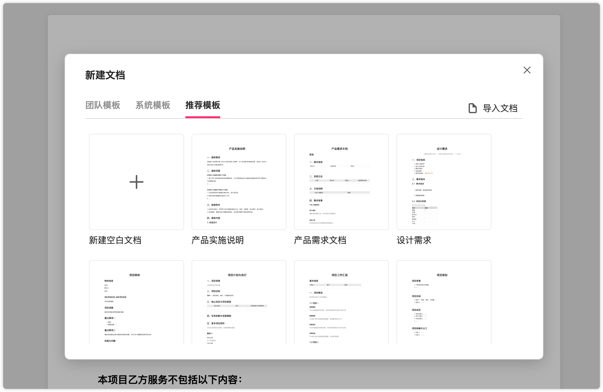 新建文档时,摹客预设了10篇推荐模板,也可以选择推荐模板新建一篇在线文档。