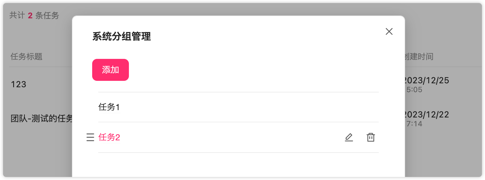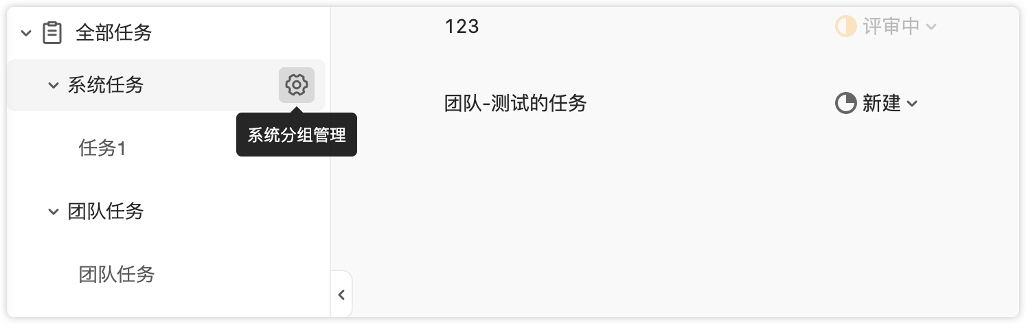 在左侧任务树上,鼠标悬停在系统任务或团队任务分类时,可以点击设置按钮进行分组管理,可以新建、删除、调整任务分组排序。